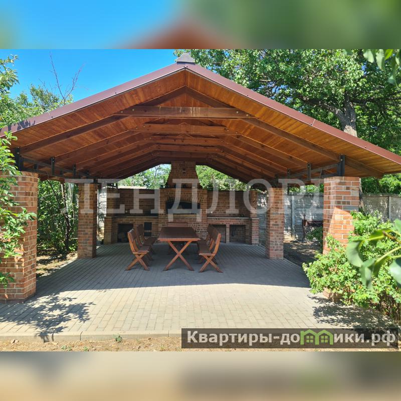 ??Вас порадует деревянный подиум под каркасный бассейн и капитальная зона барбекю из кирпича со столом и лавочками из цельного дерева
