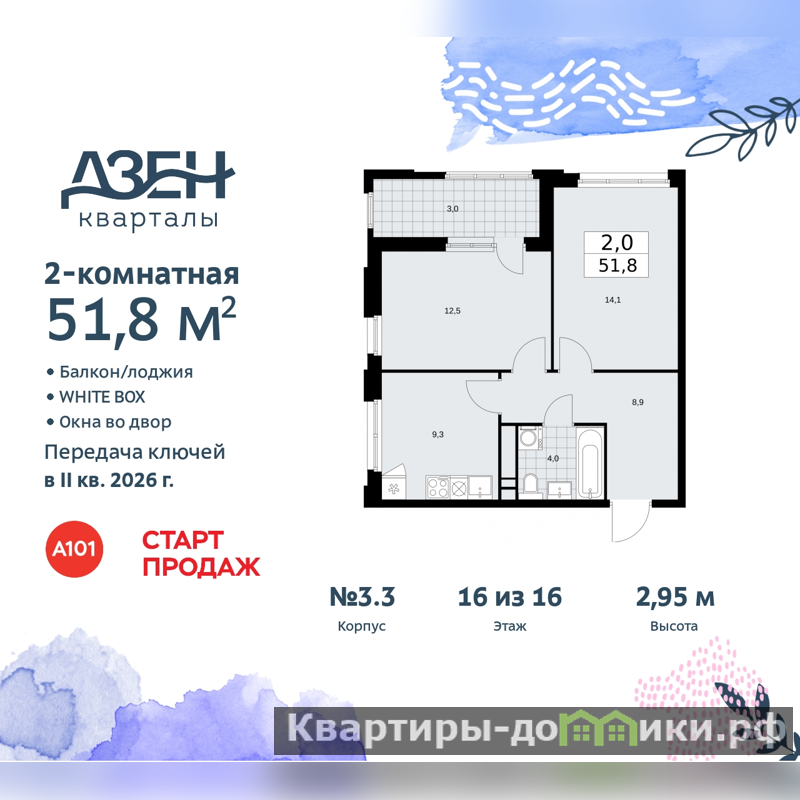 Двухкомнатная квартира с отделкой в ЖК "Дзен-кварталы" на 16 этаже. Общая площадь: 51.8 кв.м., жилая: 26.6 кв.м., площадь просторной кухни-столовой: 9.3 кв.м. Угловая квартира, окна oбecпeчивaют paвнoмepнoe ocвeщeниe в тeчeниe дня. В квартире одна лоджия, один совмещенный санузел. Высота потолков 2.95 м.