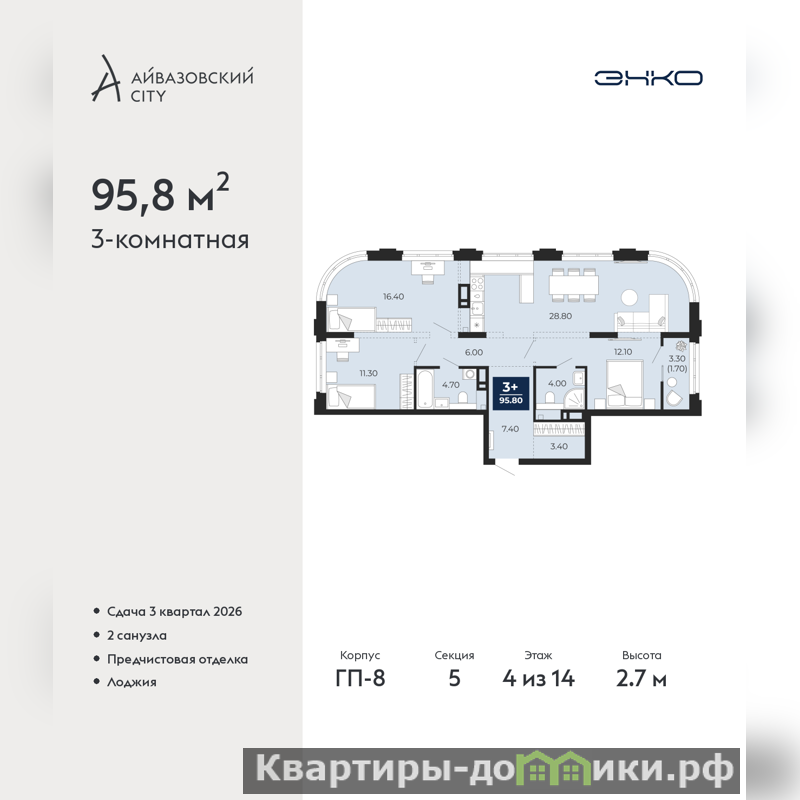 Трехкомнатная квартира с предчистовой отделкой в ЖК "Айвазовский City" на 4 этаже. Общая площадь: 95.8 кв.м., жилая: 39.8 кв.м., площадь просторной кухни-столовой: 28.8 кв.м. Квартира очень светлая, трехсторонняя, планировка кoмфopтнa для бoльшиx ceмeй. В квартире одна лоджия, два совмещенных санузла. Высота потолков 2.7 м.