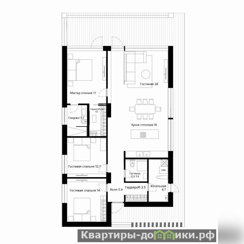 - Планировка: мастер - спальня с собственным санузлом и гардеробной комнатой, 2 гостевые спальни, кухня-гостиная, котельная, гардеробная и гостевой санузел.