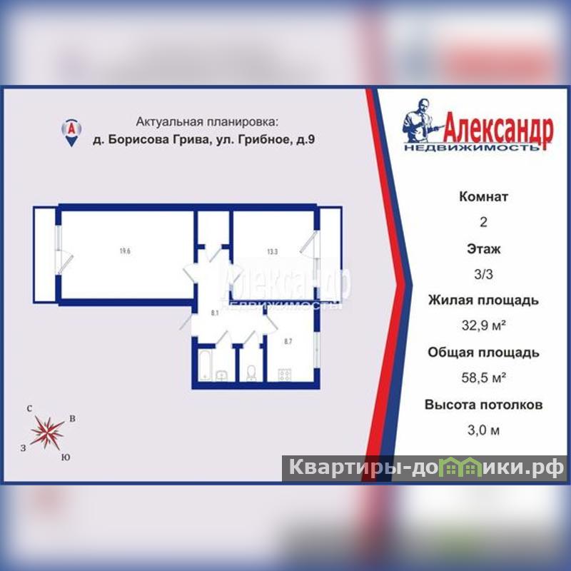 1699914 Продам 2х к.кв. общей площадью 58.5 кв.м двухстороннюю, с двумя балконами, расположенную на 3 этаже кирпичного дома 1959 года постройки.<br/>Состояние квартиры: <br/>Заезжай и живи!<br/> <br/>Квартира с советским ремонтом, очень ухоженная, чистая, без посторонних запахов, много света, очень тёплая.<br/><br/>Деревянные окна, отреставрированы, без щелей, аккуратно окрашены, потолки 3 метра, ровные, чистые, крашенные.<br/>Дверь входная металлическая, межкомнатные из массива.<br/>Полы ровные, не скрипучие, доска, сверху фанера и покрашены половой краской, на кухне и в коридоре застелены линолеумом.<br/>Комнаты с балконами, изолированные, распашонка.<br/> Окна квартиры выходят на северную и южную сторону.<br/>Просторная кухня 8,7 кв.м, Электроплита, и в резерве есть плитка с подключением к газовому баллону, центральное водоснабжение, горячая вода из бойлера. <br/>Раздельный санузел.<br/>Туалет 1,5 м2<br/>Стандартная ванная, место для стиральной машины, бойлер 80 литров.<br/><br/>Коридор 8 кв.м. с гардеробной и встроенным шкафом.<br/><br/>Высота потолков 3 м.<br/>Над квартирой тех этаж, крыша добротная без протечек и щелей.<br/>Толстые стены, широкие подоконники, много света.<br/>Тишина и комфорт!<br/>Хорошие дружные соседи, чистый двор, чистый воздух и тишина.<br/>п.Грибное <br/>Всеволожского р-на, ЛО.<br/>Бывшая военная часть, всего 20 домов.<br/>В посёлке есть всё необходимое для жизни.<br/>Свой детский сад,<br/> магазин 24 часа, <br/>фельдшерский пункт, <br/>два автобуса для школьников, <br/>И автобус- маршрутка по расписанию электричек (остановка Грибное - ж/д " Борисова Грива" туда и обратно)<br/> От "Борисова Грива" до "Финляндского вокзала" на электричке 1час 10минут. До Всеволожска 30 минут.<br/><br/>Два взрослых собственника. <br/>Обременений и долгов нет. <br/>Прямая продажа.<br/>Подходит под любую форму оплаты:<br/>Ипотека, сертификат, мат. капитал, наличные средства.<br/>Звоните! Отвечаю быстро. Организую просмотр...