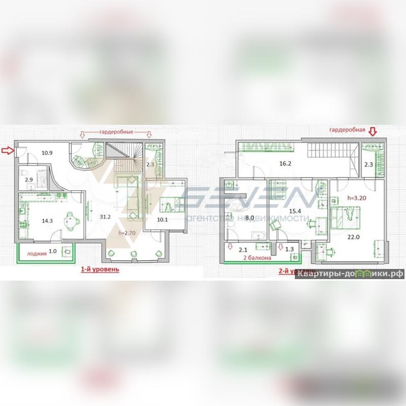 На первом уровне расположена кухня-столовая, площадью: 14,3 м2 с выходом на балкон, санузел: 2,9 м2, две комнаты: 10,1 м2 с гардеробной и 31,2м2, высота потолков первого уровня - 2.8 м.