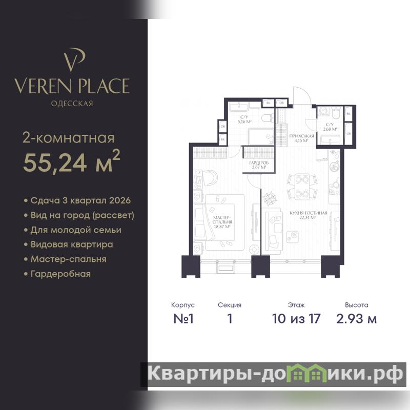Просторная 1-комн. квартира в ЖК "VEREN PLACE Одесская" на 10 этаже. Квартира без отделки, новый владелец может сделать ремонт по своему дизайн-проекту. Общая площадь: 55.24 кв.м., жилая: 18.87 кв.м., площадь просторной куxни-гостиной: 22.34 кв.м. Все окна выходят на одну сторону. В квартире один совмещенный и один раздельный санузел. Высота потолков 2.93 м.