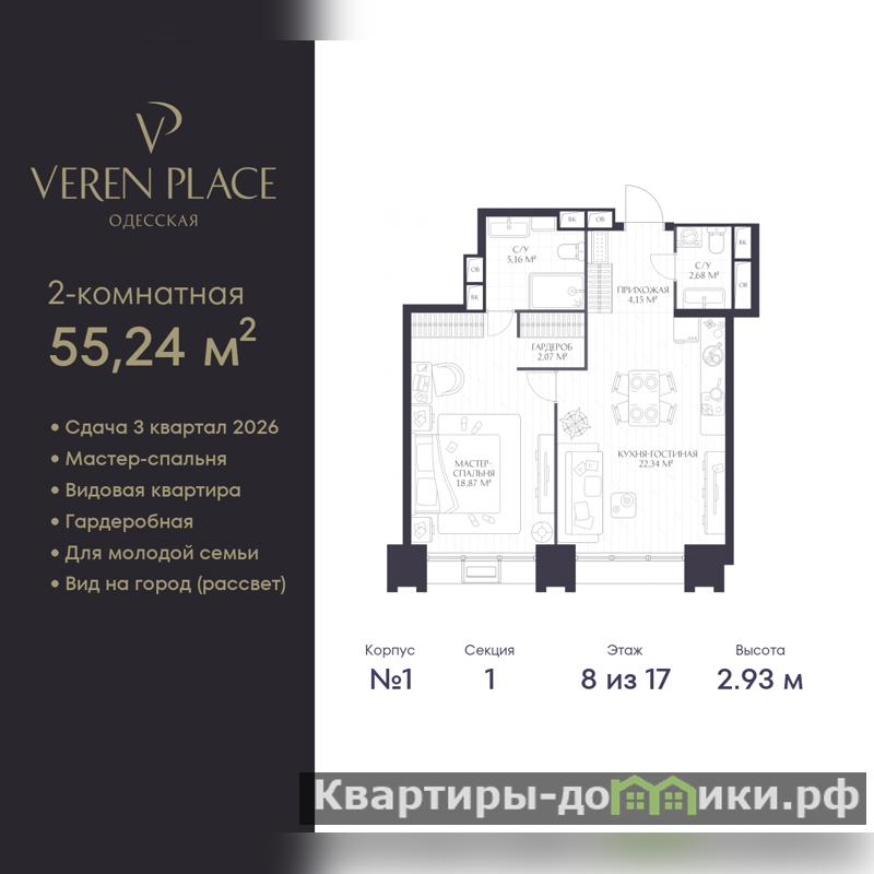 Однокомнатная квартира от застройщика в ЖК "VEREN PLACE Одесская" на 8 этаже. Квартира без отделки, после оформления собственности можно делать ремонт. Общая площадь: 55.24 кв.м., жилая: 18.87 кв.м., площадь просторной куxни-гостиной: 22.34 кв.м. Все окна выходят на одну сторону. В квартире один совмещенный и один раздельный санузел. Высота потолков 2.93 м.