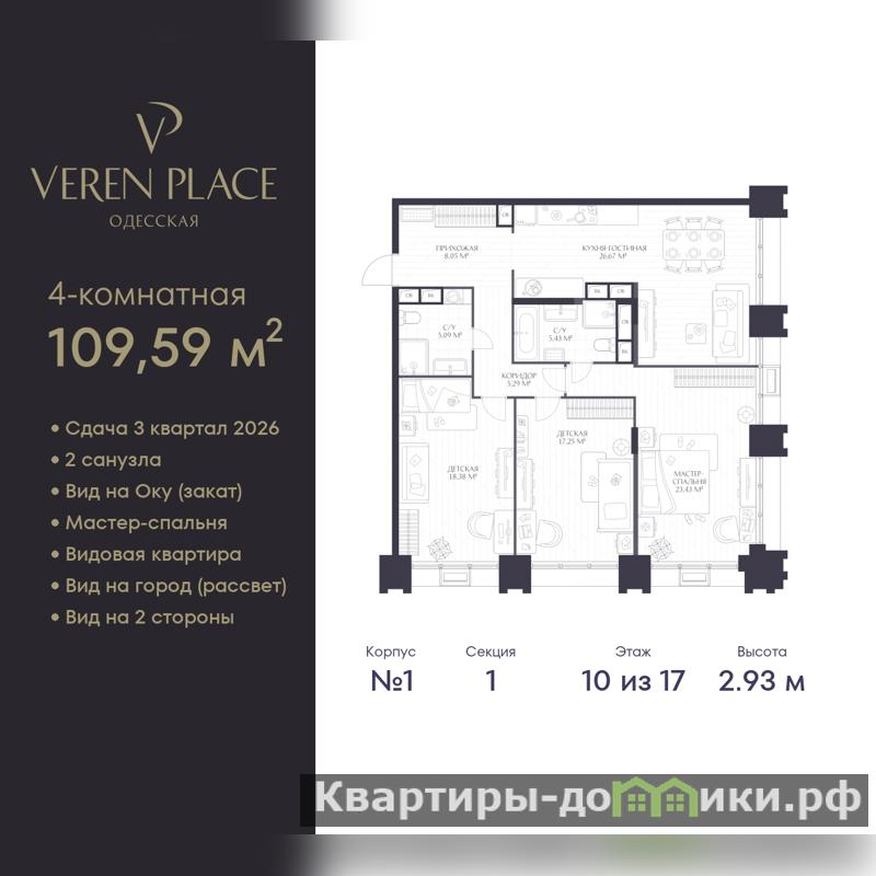 Продается 3-комн. квартира в ЖК "VEREN PLACE Одесская" на 10 этаже. Квартира без отделки, после оформления собственности можно делать ремонт. Общая площадь: 109.59 кв.м., жилая: 59.06 кв.м., площадь просторной куxни-гостиной: 26.67 кв.м. Квартира угловая, очень светлая, естественная вентиляция при открытии окон. В квартире два совмещенных санузла. Высота потолков 2.93 м.