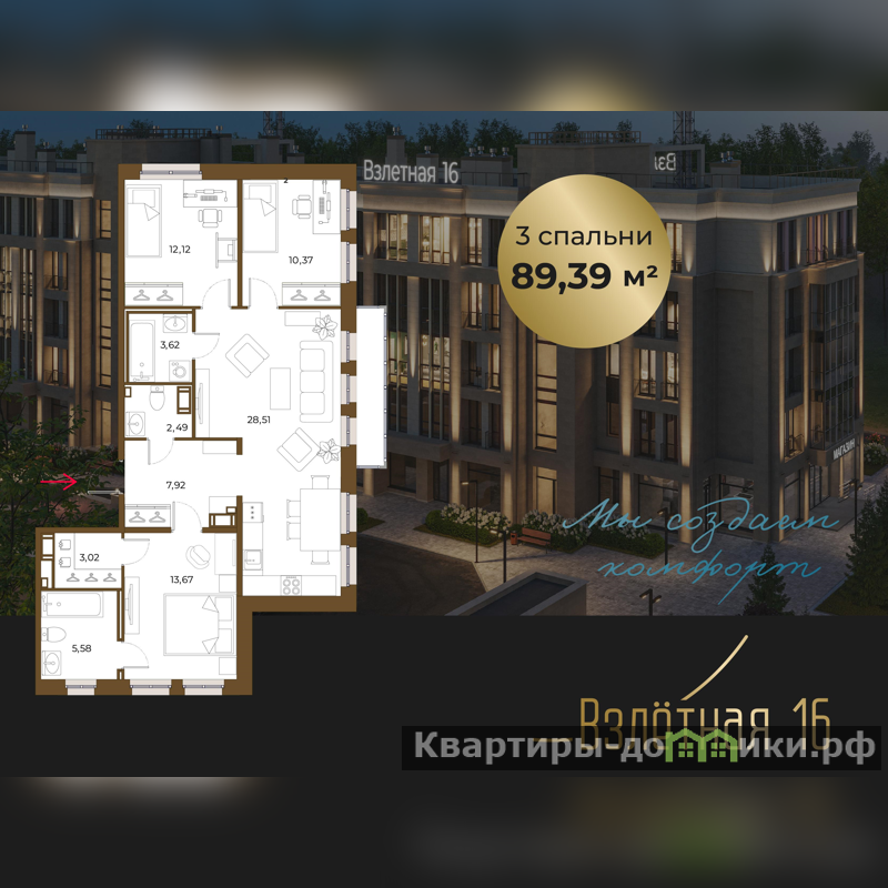 Общая площадь квартиры составляет 89.39 м2 из которых 28,51 м2 отведено под просторную кухню-гостиную с пятью окнами, что обеспечивает максимально большое количесвта света. Мастер спальня площадью 13,67 с двумя окнами, со своим сан.узлом, в котором предусмотрено окно и отдельная гардеробная. Две спальни площадью 12,12 м2 и 10,37 м2