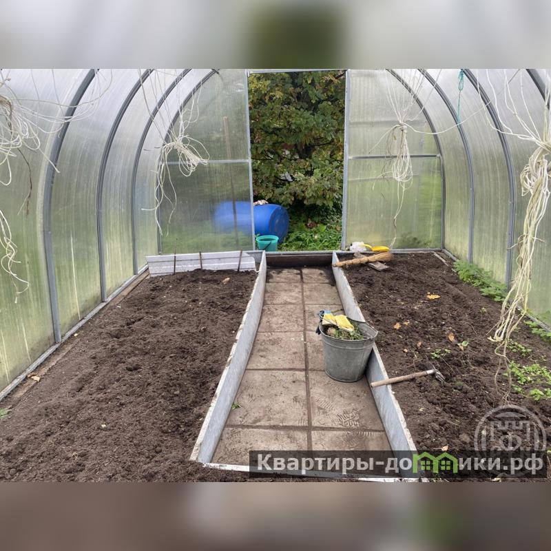 Земельный участок правильной формы площадью 11,6 соток находится в собственности и размежеван. На нём расположены парник и колодец с четырьмя кольцами. Забор представляет собой сочетание сетки рабицы и металлического профиля, с воротами и удобным заездом для автомобиля.