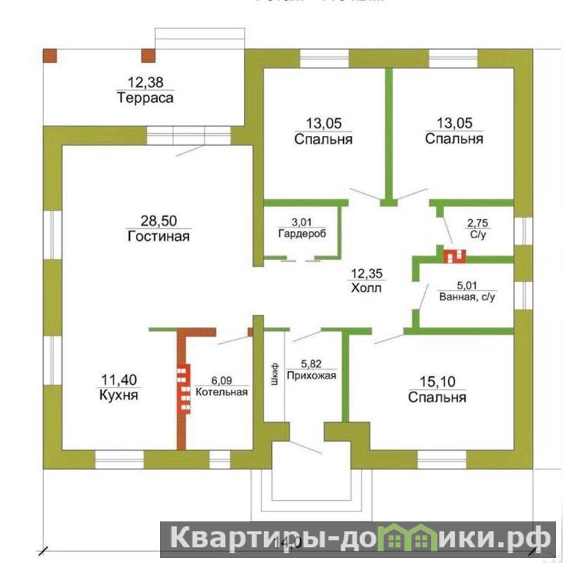 Продуманная планировка дома: просторный холл, кухня- гостиная с выходом на террасу- 40 кв.м, три спальни по 15 кв.м, котельная 6 кв.м., холл, два санузла, гардеробная., прихожая и крыльцо.