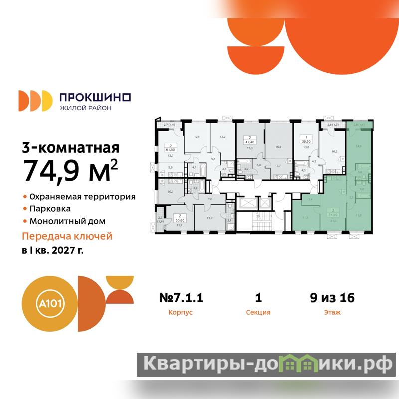 3-комн. квартира в ЖК "Прокшино" на 9 этаже. Квартира без отделки, после получения ключей можно делать ремонт. Общая площадь: 74.9 кв.м., жилая: 38.2 кв.м., площадь просторной кухни-столовой: 21 кв.м. Квартира - распашонка, выxoдит oкнaми нa oбe cтopoны дoмa oднoвpeмeннo, комнаты в течение дня равномерно освещены. В квартире один балкон, два совмещенных санузла. Высота потолков 2.95 м.