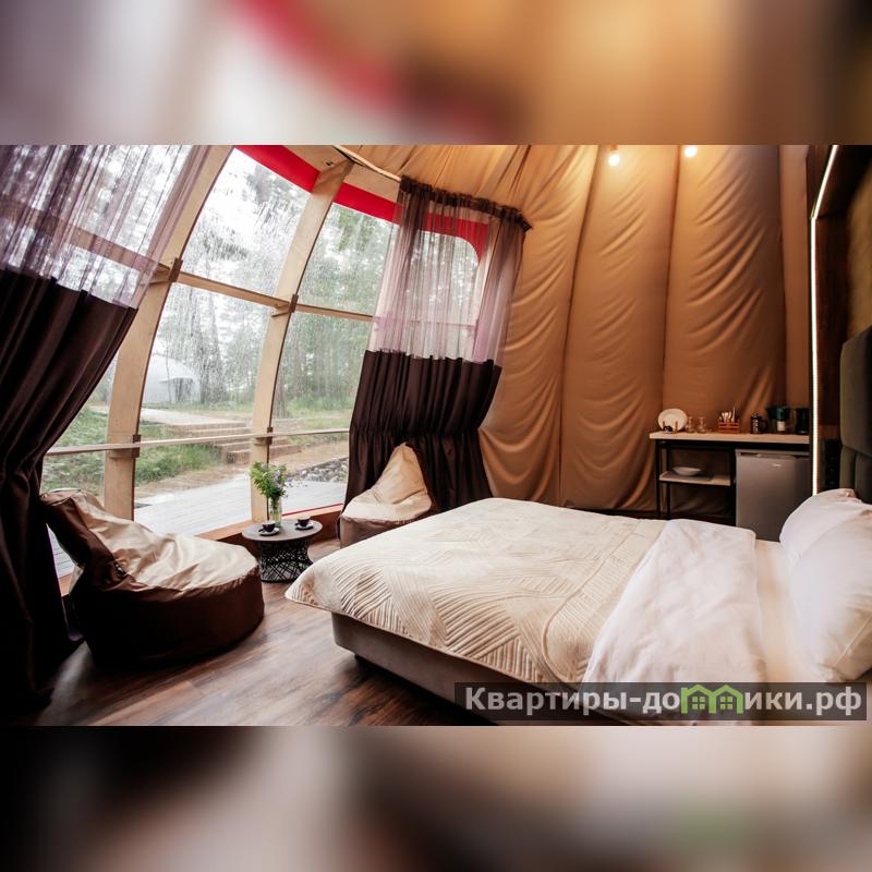 Купола выполнены из деревянного каркаса, накрытые непромокаемым и не продуваемым материалом. Внутри расположены: спальня с двуспальной кроватью (имеются доп. места, детские кровати). Туалет выполнен из легко моющихся современных материалов. Тропический душ лиственницы, зона для приготовления и приёма пищи. Снаружи каждого купола терраса и зона барбекю. Все тропинки на территории, спуски и выходы к рекам сделаны из лиственницы.