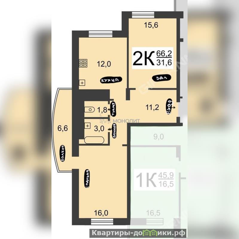 Высота потолков 2.8 м., просторная кухня 12 м2., зал 15,6 м2., спальня 16 м2,с выходом на балкон.