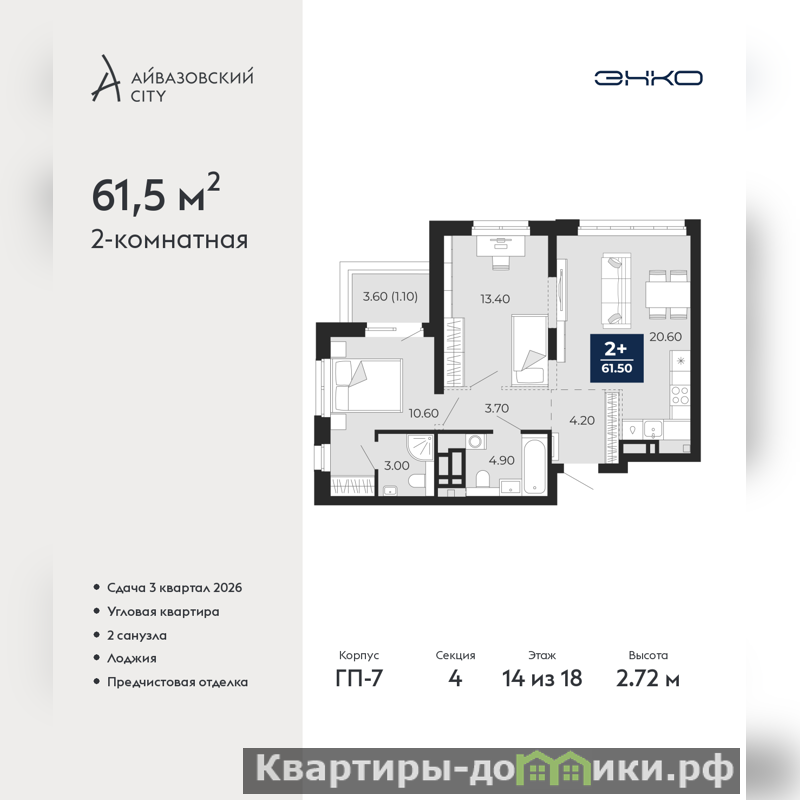 Продается 2-комн. квартира от застройщика с предчистовой отделкой в ЖК "Айвазовский City" на 14 этаже. Общая площадь: 61.5 кв.м., жилая: 24 кв.м., площадь просторной кухни-столовой: 20.6 кв.м. Угловая квартира, окна oбecпeчивaют paвнoмepнoe ocвeщeниe в тeчeниe дня. В квартире одна лоджия, два совмещенных санузла. Высота потолков 2.72 м.