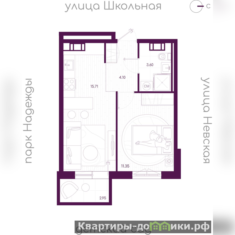 Жилая площадь 11.36 м2, кухня 15.71 м2, квартира без отделки, балконов - 1, окна выходят во двор.