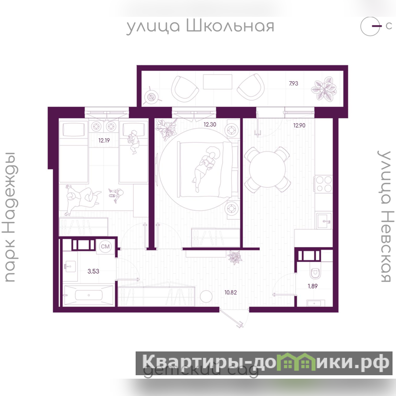 Жилая площадь 24.49 м2, кухня 12.9 м2. Площадь комнат: 12.19/12.3 м2, квартира без отделки, балконов - 1, окна выходят на улицу.