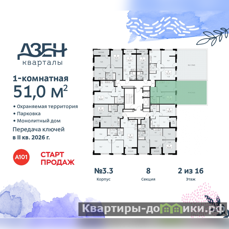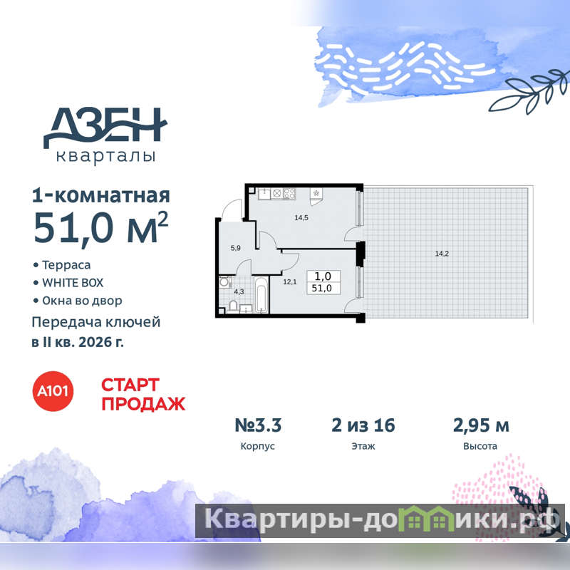 Однокомнатная квартира от застройщика с отделкой в ЖК "Дзен-кварталы" на 2 этаже. Общая площадь: 51 кв.м., жилая: 12.1 кв.м., площадь просторной кухни-столовой: 14.5 кв.м. Все окна выходят на одну сторону. В квартире один балкон, один совмещенный санузел. Наличие террасы в квартире дает возможность для обустройства дополнительной площади. Высота потолков 2.95 м.
