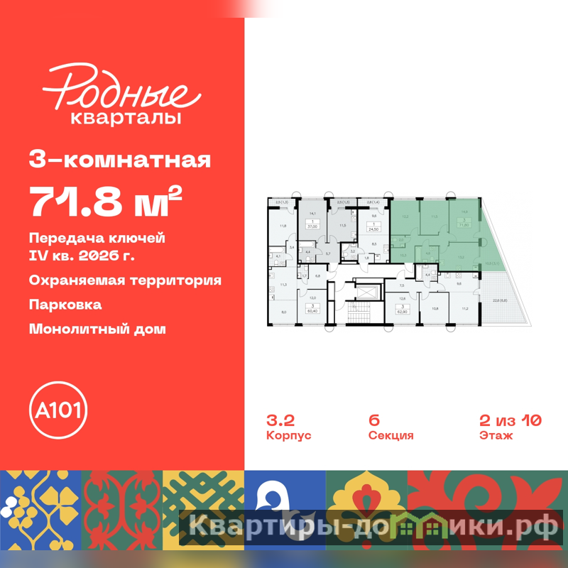 Дом монолитный, двухподъездный, высотой 10 этажей. Квартира находится во 2-й секции в корпусе 3.2. На этаже 5 квартир. В подъезде 1 грузовой лифт. Начало строительства - 2 квартал 2024 года. Окончание строительства - 4 квартал 2026 года. Оформление сделки по договору долевого участия.
