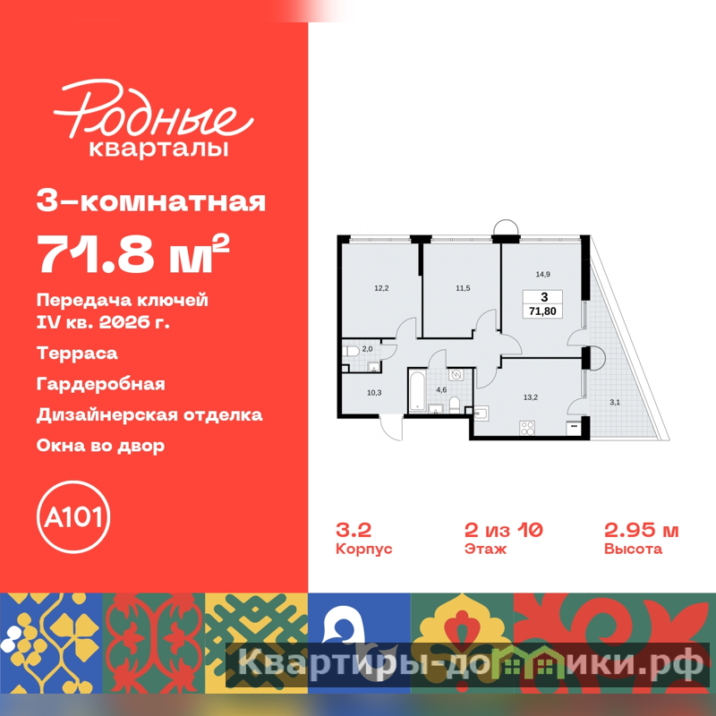 Трехкомнатная квартира от застройщика с отделкой в ЖК "Родные кварталы" на 2 этаже. Общая площадь: 71.8 кв.м., жилая: 38.6 кв.м., площадь просторной кухни-столовой: 13.2 кв.м. Квартира угловая, очень светлая, естественная вентиляция при открытии окон. В квартире один балкон, один совмещенный и один раздельный санузел. Терраса представляет собой роскошную зону отдыха для проведение вечеров в кругу семьи и друзей или организация вечеринок. Высота потолков 2.95 м.