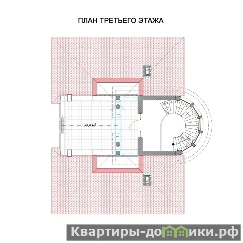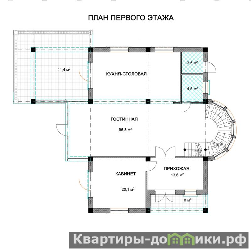 Общая площадь дома 414 м2, жилая площадь 190 м2. На первом этаже расположены: кухня-гостиная - 96,8 м2 с выходом на большую террасу 41 м2; гостевая комната (кабинет) – 20,1 м2; прихожая - 13,6 м2; санузел - 4,5 м2 и котельная - 3,5 м2 с отдельным входом с улицы.