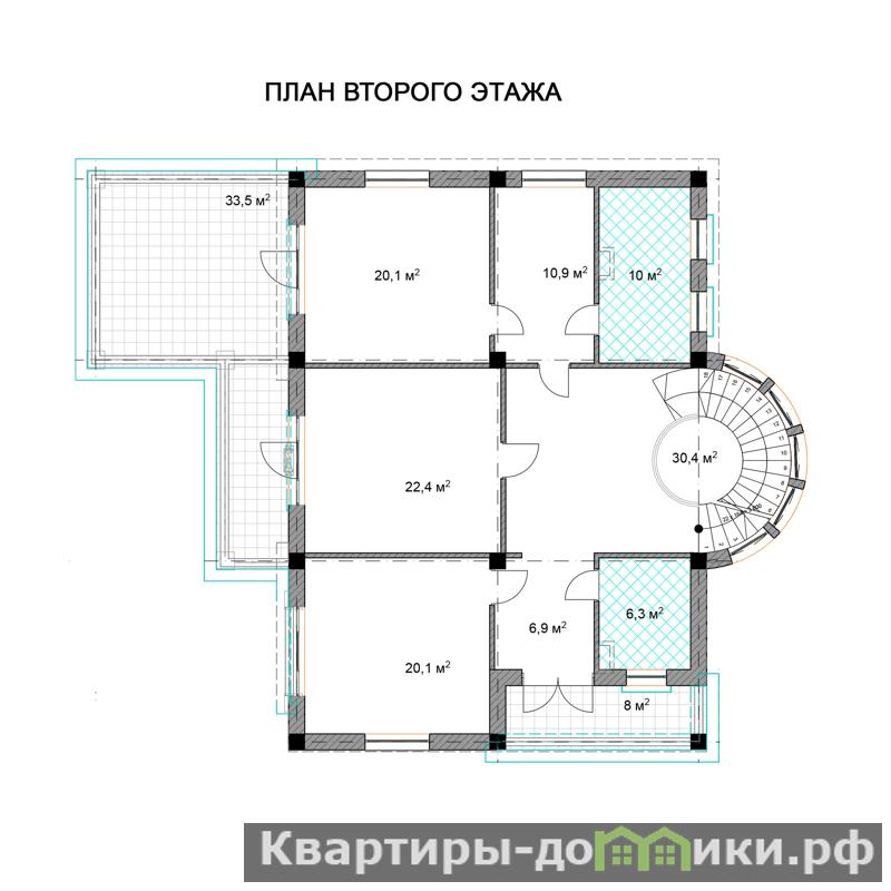 На втором этаже расположены три спальни с видом на море: спальня - 20,1 м2 с гардеробной и собственным санузлом 10 м2 и с выходом на террасу 33 м2; спальня - 22,4 м2 с выходом на балкон; спальня - 20 м2; санузел - 6,3 м2; холл с выходом на общий балкон 8 м2.