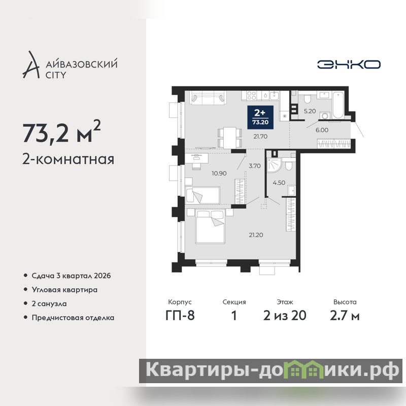 Продается 2-комн. квартира от застройщика с предчистовой отделкой в ЖК "Айвазовский City" на 2 этаже. Общая площадь: 73.2 кв.м., жилая: 32.1 кв.м., площадь просторной кухни-столовой: 21.7 кв.м. Квартира угловая, идеально подойдет любителям тишины и панорамных видов. В квартире два совмещенных санузла. Высота потолков 2.7 м.