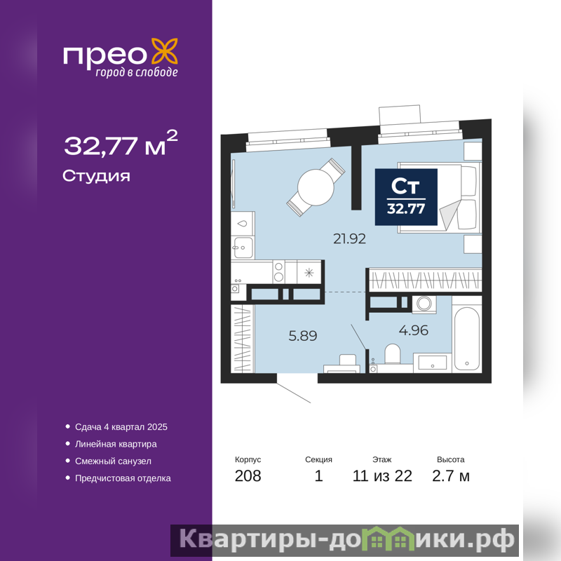 1-комн. квартира-студия с предчистовой отделкой в ЖК "Прео" на 11 этаже. Общая площадь: 32.77 кв.м., площадь гостиной 21.92 кв.м., из которых 5 кв.м. выделено под кухонную зону. Все окна выходят на одну сторону. В квартире один совмещенный санузел. Высота потолков 2.7 м.