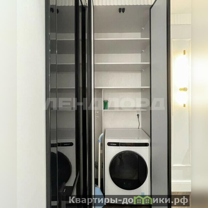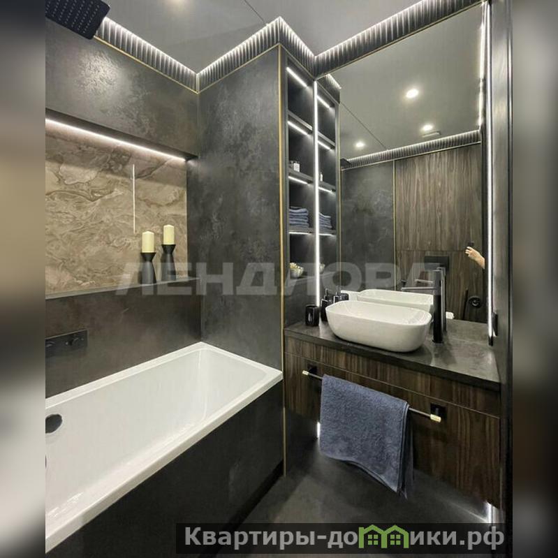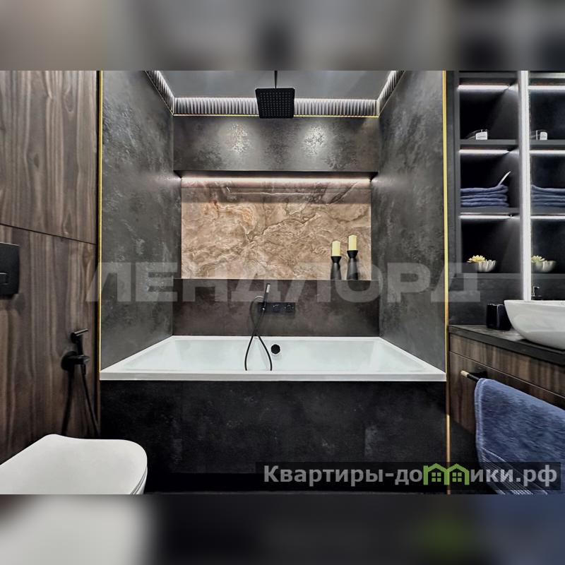 Ванна облицована крупноформатным керамогранитом (Италия), смеситель в душе встроенный с терморегулятором и тропическим душем, установлен отдельный гигиенический душ, есть проточный водонагреватель Аristоn. Датчики протечки: в кухне, ванной, постирочном шкафу. Установлен программируемый теплый пол. Продуманы системы хранения. Стиральная машина с сушкой.