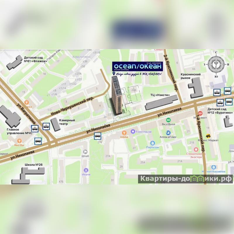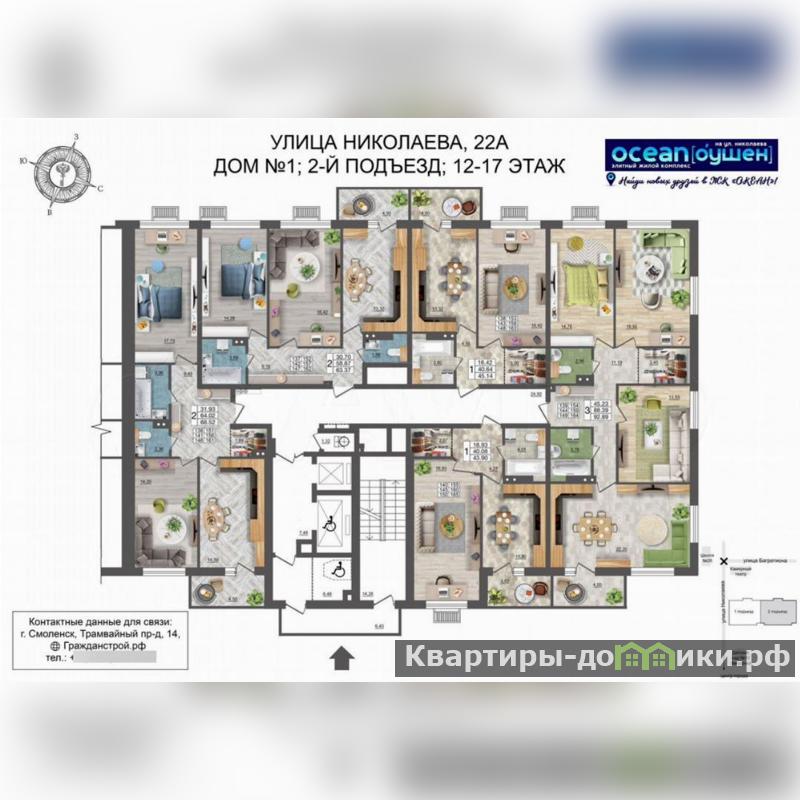 ГРАЖДAНСTPОЙ с гордоcтью прeдставляeт 1 oчepедь стрoитeльcтвa жилoго комплекса OКЕАH в центральной части гоpoдa Cмoлeнскa. Pаспoлoженный на первой линии улицы Hиколaевa 18-этaжный жилой дoм безуcлoвно станeт центром внимания жителeй и гocтeй гoрода. Дoм cвoим обликом говорит о комфортной и красивой жизни. Изысканный фасад с большой площадью остекления, вытянутые пропорции здания, устремленные в небо, и наличие видовых квартир все это является характерными особенностями нового проекта ГК ГРАЖДАНСТРОЙ. Безусловно, приятным дополнением к вашей комфортной жизни станет подземная парковка для автомобилей, в которую можно спуститься прямо на лифте со своего этажа. Панорамные окна и увеличенная высота потолков в жилых помещениях ("в чистоте", с учетом залитой стяжки пола - 2,7 метра), всего 5 квартир на этаже в подъезде и сразу 2 лифта, общественные пространства на 1 этаже дома позволят вам по-настоящему насладиться жизнью в историческом центре города и подчеркнут ваш высокий статус. Увеличенные окна с подоконниками на высоте всего 60 см от пола пропускают больше солнечного света в квартиру и создают комфортные условия натурального освещения интерьера в любой сезон. Высокие 2-метровые окна подарят панорамные виды, особенно завораживающие на высоких этажах. Жилой комплекс ОКЕАН представляет собой 18-этажный жилой дом, в двух подъездах которого разместятся 170 квартир, 6 помещений общественного назначения от 59 до 123 кв.м. и 61 место на подземной закрытой автостоянке. Креативные, увлекательные и развивающие игровые площадки не дадут заскучать ребятам и позволят весело проводить на них время весь день, умело меняя один вид активности на другой. Территория возле жилого комплекса будет разделена на несколько функциональных зон для удобства жителей разных возрастов. Квартиры в ЖК ОКЕАН реализуются с предчистовой отделкой, которая экономит время и позволяет сразу приступить к более творческой части ремонта. Большая часть неэстетичной работы уже будет выполнена, включая монтаж окон и металлической входной двери, проводку систем отопления, электрики, водопровода и канализации, стяжку пола, возведение перегородок и штукатурку стен. Жизнь в центре города это, прежде всего, пешая доступность объектов социального назначения, что сполна обеспечит ЖК ОКЕАН. Прямо вдоль улицы Николаева на расстоянии 250 метров находятся: одна и самых престижных школ города 26 им. А.С. Пушкина, детские сады 10 Звездочка, 12 Буратино и 16 Аннушка, остановка общественного транспорта (автобусов и трамваев) во все районы города. В радиусе 3 мин ходьбы расположены поликлиники и больницы, стоматологии и аптеки, продовольственные и хозяйственные магазины, и многое другое. Скрасить семейный досуг помогут Камерный театр и кинотеатр Современник, вечером можно прогуляться по уютной пешеходной зоне