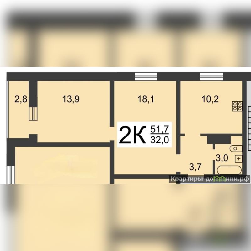 Удачная планировка: кухня 10,2 кв. м, комнаты площадью 18.1 кв. м. и 13,9 кв. м. с выходом на лоджию, прихожая 3,7 кв. м, совмещённый санузел в кафеле.