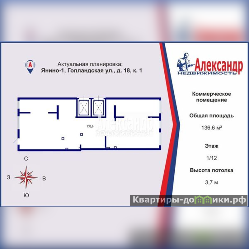 1701894 В аренду фасадное нежилое помещение площадью 136,6 квадратных метров с отдельным входом!<br/><br/>Предлагаем вашему вниманию просторное коммерческое помещение на первом этаже нового жилого комплекса первая очередь которого сдалась в эксплуатацию в конце 2023 года. В комплексе располагается всего более 1500 квартир, что обеспечит высокий поток клиентов. Самое коммерческое помещение расположено в уже построенном доме, в котором завершается заселение.<br/><br/>Характеристики помещения:<br/>- площадь: 136,6 кв.м;<br/>- высота потолков: 3,7 м;<br/>- электрическая мощность: 27 кВт/ч;<br/>- возможность обустройства санузлов;<br/>- подводы: горячая и холодная вода, канализация, отопление;<br/>- большие витринные окна для отличной видимости.<br/><br/>Комфортный безбарьерный вход и удобная парковка прямо напротив. <br/><br/>Цена: в первый год — 1700 рублей за кв.м, с дальнейшим увеличением. Гибкие условия сотрудничества, предоставление арендных каникул.<br/><br/>Это помещение идеально подойдет для магазина, кафе, салона красоты, аптеки или офиса. Высокие потолки и открытая планировка позволять реализовать максимально универсальные бизнес-задачи.<br/><br/>Не упустите шанс стать владельцем коммерческого помещения в одном из перспективных районов поселка Янино-1 Ленинградской области!<br/><br/>Звоните, отвечу на вопросу и организую просмотр!<br/>