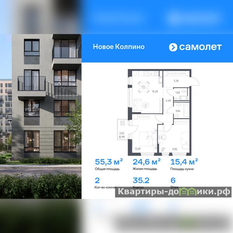 Предлагается 2-комнатная квартира комфорт-класса 55,3 кв.м в корпусе 35.2 на 6 этаже, в ЖК Новое Колпино