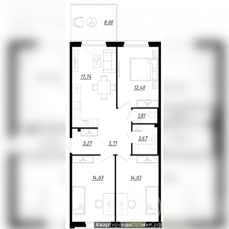 Для большой счастливой семьи предлагаем функциональную 4Е евро квартиру общей площадью 75,06 м2, в которую входят просторная кухня-гостиная 17,74 м2, две комнаты по 14,03 м2 и одна 12,40 м2, прихожая 8,98 м2 и раздельный санузел. Все комнаты правильной формы, что очень функционально. Ко всему этому для Вас есть приятный бонус - в виде своей террасы площадью 8 м2