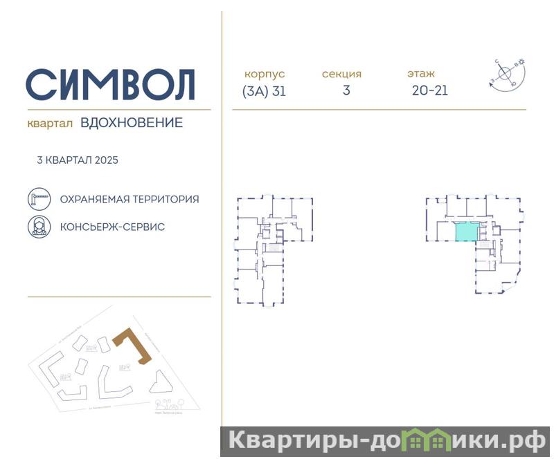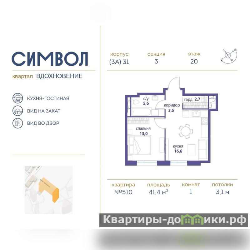 Продается 1-комнатная квартира от застройщика: общая площадь 41.40 м, жилая 13.00 м, кухня 16.60 м, 20-й этаж, жилой квартал Вдохновение, корпус 31 (секция 3) . Срок сдачи: 3 квартал 2025 года.