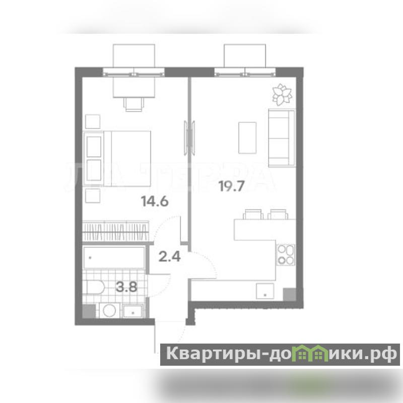 Общая площадь квартиры 40,50 квм, обратите внимание, кухня-гостинная 19,7 квм, отдельная спальня-14,6 квм, санузел просторный, легко устанавливается большая ванна-3,8 квм. Квартира с отделкой.