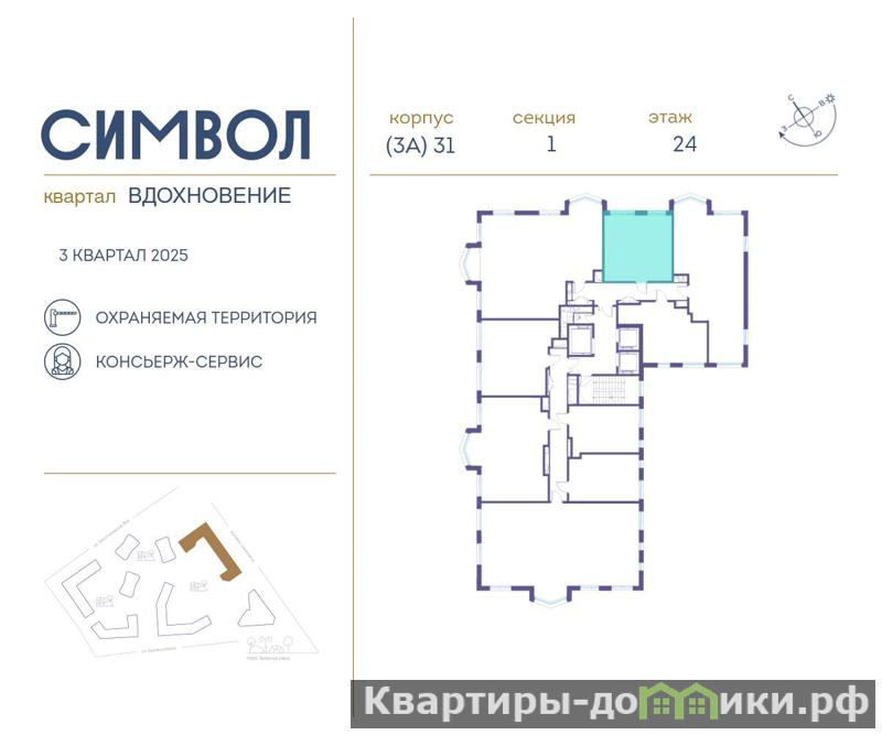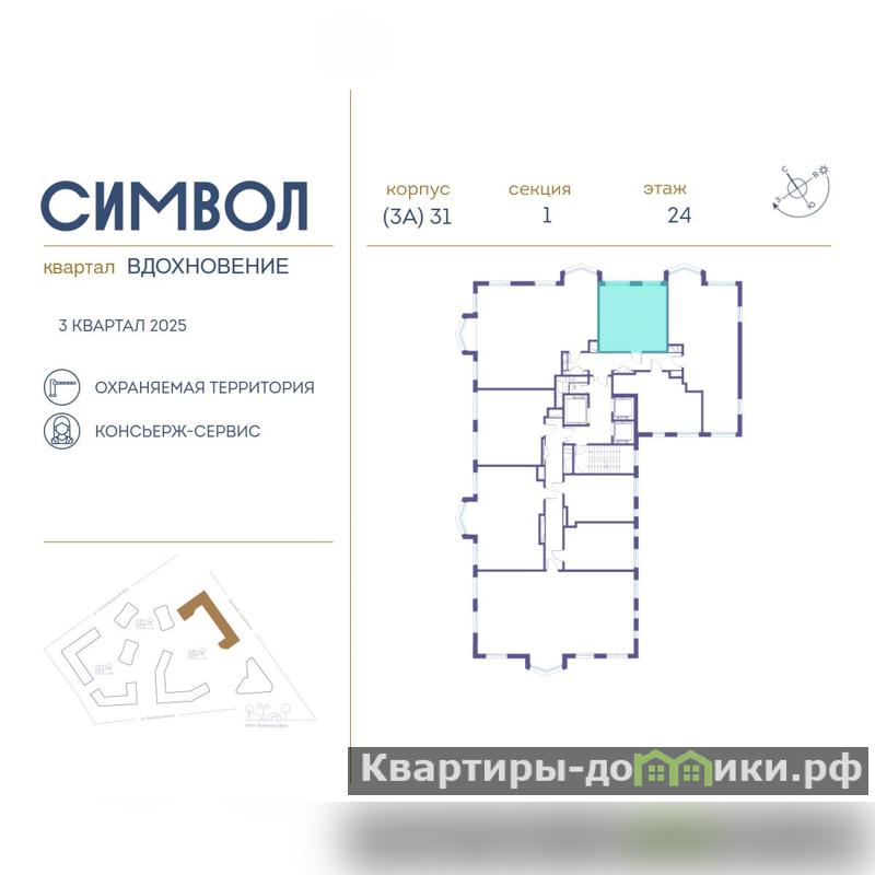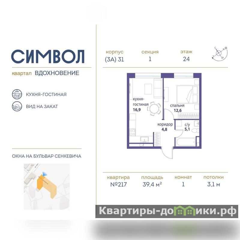 Продается 1-комнатная квартира от застройщика: общая площадь 39.40 м, жилая 12.60 м, кухня 16.90 м, 24-й этаж, жилой квартал Вдохновение, корпус 31 (секция 1) . Срок сдачи: 3 квартал 2025 года.