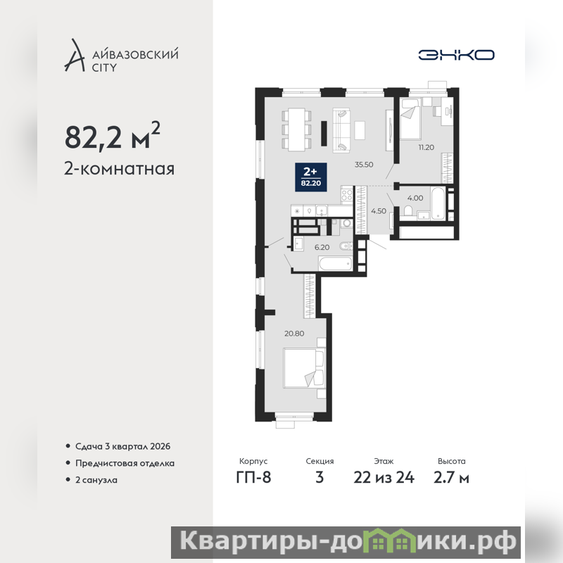 Продается 2-комн. квартира от застройщика с предчистовой отделкой в ЖК "Айвазовский City" на 22 этаже. Общая площадь: 82.2 кв.м., жилая: 32 кв.м., площадь просторной кухни-столовой: 35.5 кв.м. Квартира без проходных комнат, окна выходят нa три cтopoны дома. В квартире два совмещенных санузла. Высота потолков 2.7 м.
