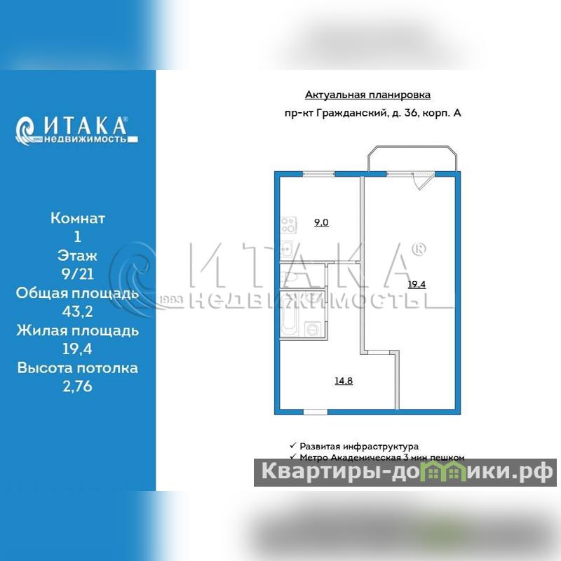 1-90699 Предлагается в прямой продаже от известного застройщика ЛЕНСПЕЦСМУ, отличная видовая 1к.кв 43.2 кв м , жилая 19.4 кв.м, с выходом на застекленный балкон, пол ламинат, кухня 9 кв. м, произведено зонирование: в зоне готовки-кафель, в столовой-ламинат, просторная прихожая 14.8 кв.м , санузел раздельный, выложен кафелем. вместительная ванная. Квартира расположена на 9 этаже 21 этажного дома. Окна выходят на Гражанский проспект и сквер. Подъез чистый, выложен кафелем и оснащен четырьмя современными лифтами, два пассажирских и два грузовых В которых установлено видеонаблюдение. Внизу консьерж. Ухоженная территория с современной детской площадкой. Сам дом расположен в шаговой доступности от метро,хорошая транспортная развязка позволяет легко добраться до любой точки города и пригорода. Развитая инфраструктура: школы, садик, поликлиника , множество магазинов и кафе, банки и почтовое отделение,гипермаркеты О кей и Максидом, торговые центры, и фитнессы. Близость стадиона "Зенит"и подросткового клуба "Смена". В квартире один взрослый собственник, документы готовы,В квартире никто не прописан, Окажу помощь в подборе ипотеки на выгодных для вас условиях. Возможен торг. Ждем ваших звонков.