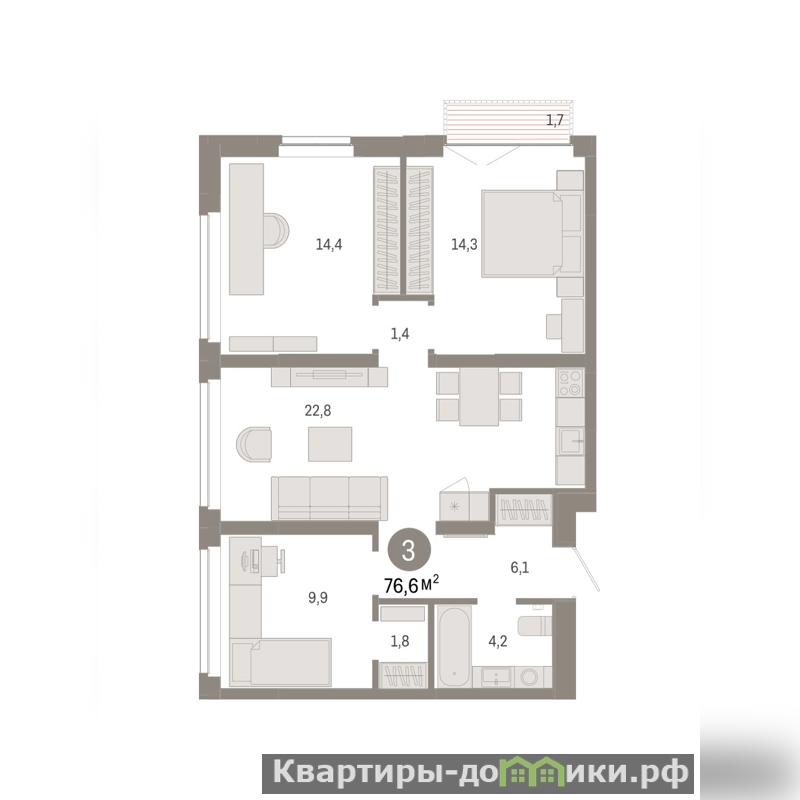 Квартира с кухней-гостиной и тремя спальнями в жилом районе Республики 205. Особенности планировки: гардеробная, рабочий кабинет, разнесённые спальни, предчистовая отделка, балкон.