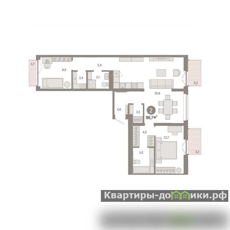 Квартира с кухней-гостиной и двумя спальнями в жилом районе Республики 205. Особенности планировки: гардеробная, вид во двор, разнесённые спальни, предчистовая отделка, мастер-спальня, постирочная, балкон.