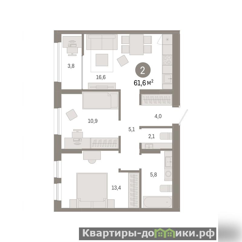 Квартира с кухней-гостиной и двумя спальнями в жилом районе Республики 205. Особенности планировки: семейная ипотека 4%, ремонт в подарок или выгода 10%, вид во двор, предчистовая отделка.