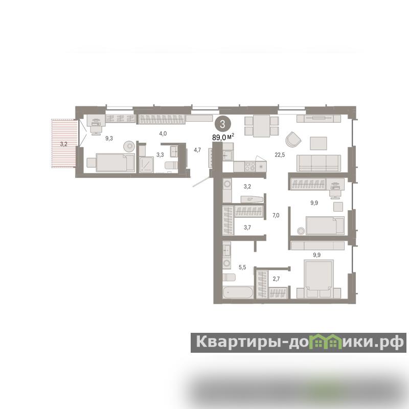 Квартира с кухней-гостиной и тремя спальнями в жилом районе Республики 205. Особенности планировки: второй санузел, гардеробная, вид во двор, разнесённые спальни, предчистовая отделка, постирочная, балкон.
