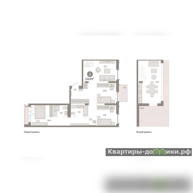 Двухуровневая квартира с кухней-гостиной и тремя спальнями в жилом районе Республики 205. Особенности планировки: без отделки, двухуровневая, вид во двор, панорамное остекление, свободная планировка, мастер-спальня, терраса, балкон, терраса на крыше.
