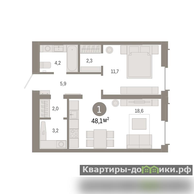 Квартира с кухней-гостиной и одной спальней в жилом районе Республики 205. Особенности планировки: гардеробная, вид во двор, предчистовая отделка, постирочная.
