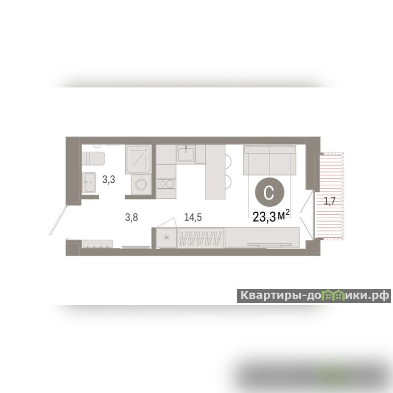 Студия в жилом районе Республики 205. Особенности планировки: предчистовая отделка, балкон.