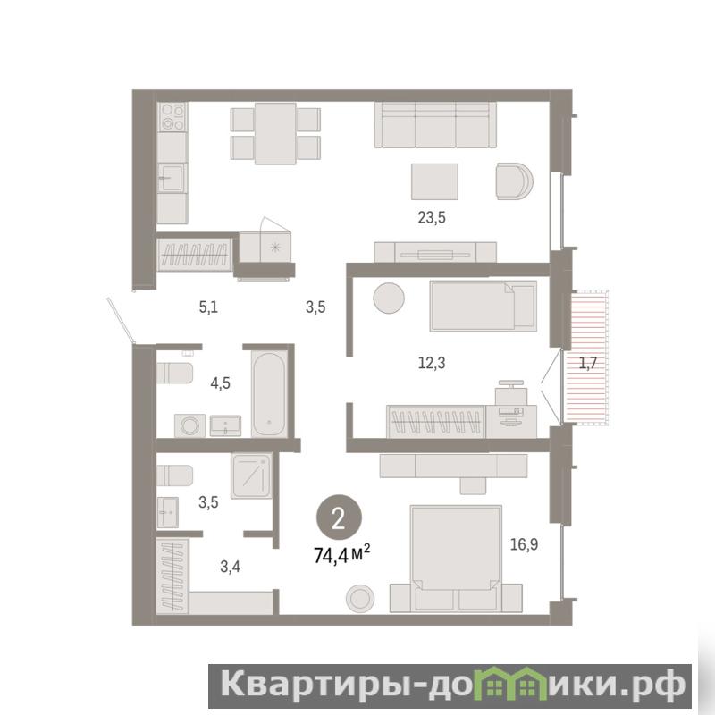 Квартира с кухней-гостиной и двумя спальнями в жилом районе Республики 205. Особенности планировки: гардеробная, предчистовая отделка, мастер-спальня, балкон.