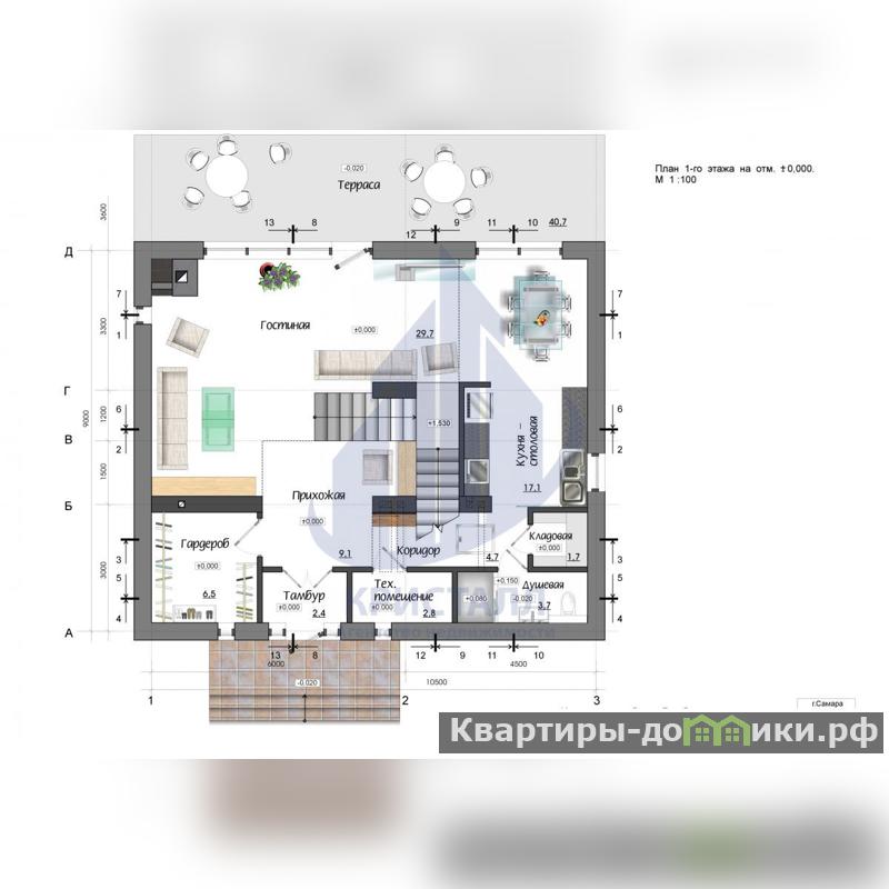 Первый этаж: Просторная гостиная с витражными окнами и камином, кухня, гардеробная, санузел с душевой кабиной, прачечная, выход на террасу с видом на Волгу.