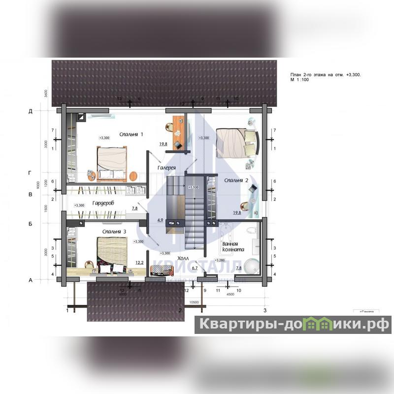 Второй этаж: Три уютные спальни, санузел с ванной и душевой кабиной.