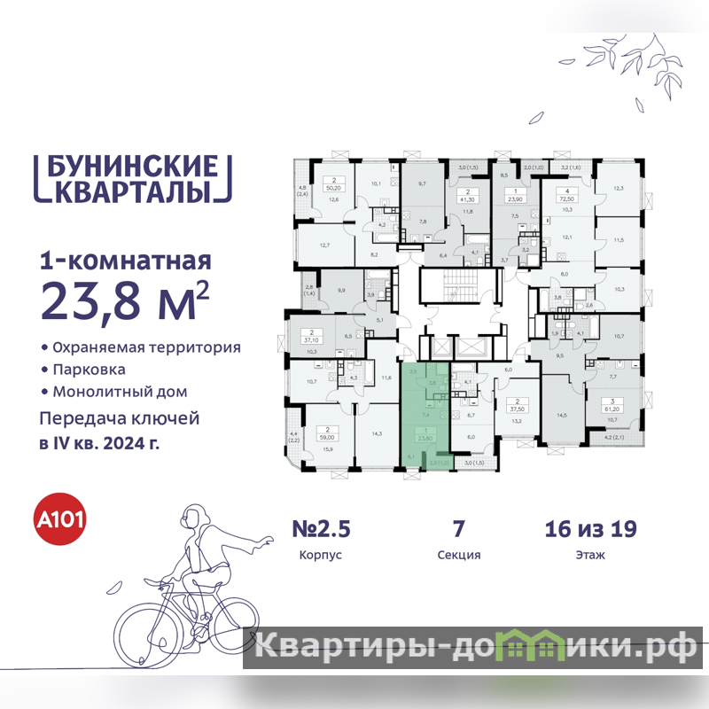 Продается однокомнатная квартира-студия от застройщика в ЖК "Бунинские кварталы" на 16 этаже. Квартира без отделки, новый собственник может сделать ремонт по индивидуальному проекту. Общая площадь: 23.7 кв.м., площадь гостиной 15.5 кв.м., из которых 7.4 кв.м. выделено под кухонную зону. Все окна выходят на одну сторону. В квартире одна лоджия, один совмещенный санузел. Высота потолков 2.99 м.