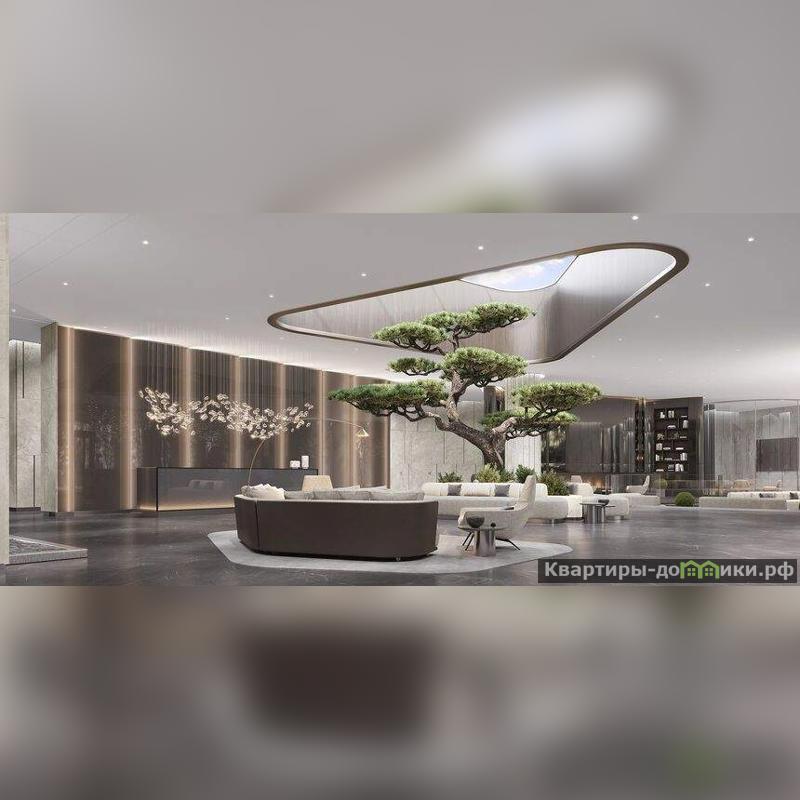 У дома предусмотрена зона дроп-офф. В интерьерах лобби использованы люксовые отделочные материалы, эксклюзивные световые инсталляции, декоративное озеленение. Премиальную атмосферу дополняют зенитный фонарь с естественным светом, водопад, лаунж у камина и библиотека. Площадь лобби 660 м2, высота потолков - до 6,5 м.