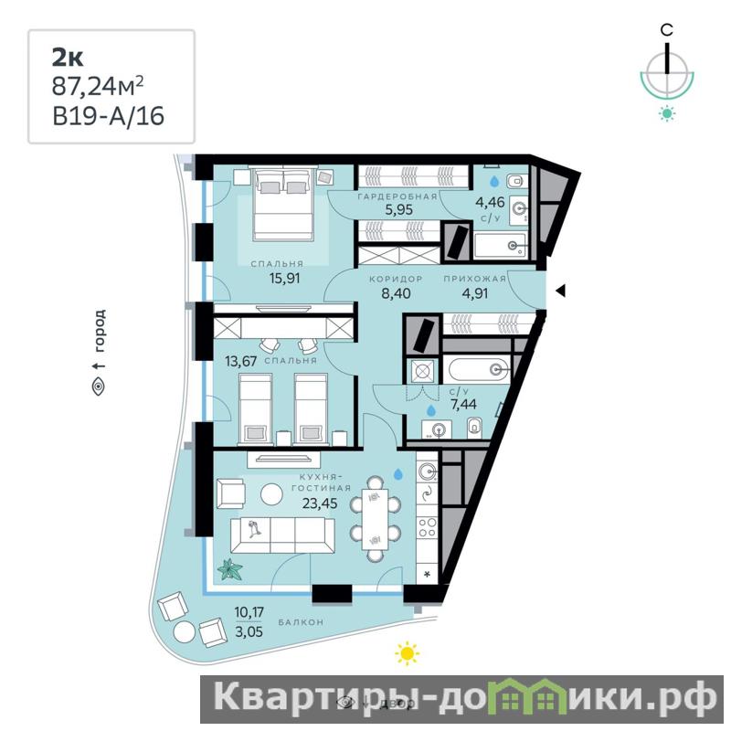 В продаже 2к квартира общей площадью 87,24 кв. м. Квартира расположена на 4 этаже 11-этажной секции корпуса Advanced в новом Рублёво-Архангельском районе Москвы, который строит Сбер. Дом находится на второй береговой линии Москвы-реки.