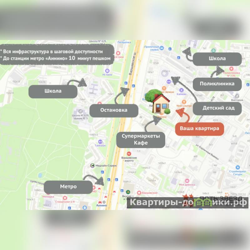 * Квартира находится в ликвидном районе города Москва. Примерно четверть территории ЖК Варшавское шоссе 141 отведена под озеленение, где расположен сквер с игровыми детскими и спортплощадками. Поблизости от комплекса функционируют несколько школ, детсадов, лицей Звездочка, центр развития ребенка. Торговых объектов в ЖК тоже предостаточно (на любой вкус): сетевые супермаркеты Дикси, Пятерочка, торговые центры Лужайка, Аннино Варшавка-33, ТРЦ Галерея Атлантис. Проходящее рядом Варшавское шоссе обеспечивает хорошую транспортную доступность. До станций метро Аннино и Улица Академика Янгеля от ЖК Варшавское шоссе 141 можно дойти буквально за 10 минут, а до железнодорожной станции Красный Строитель - примерно за 15 минут.